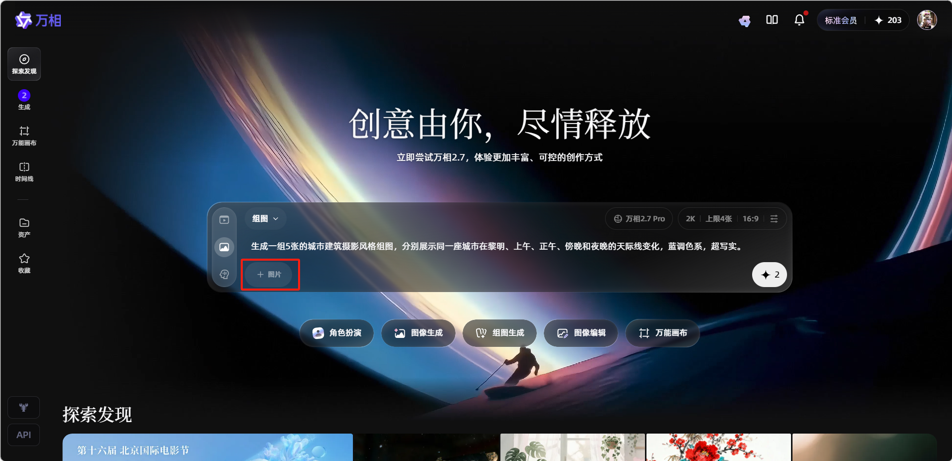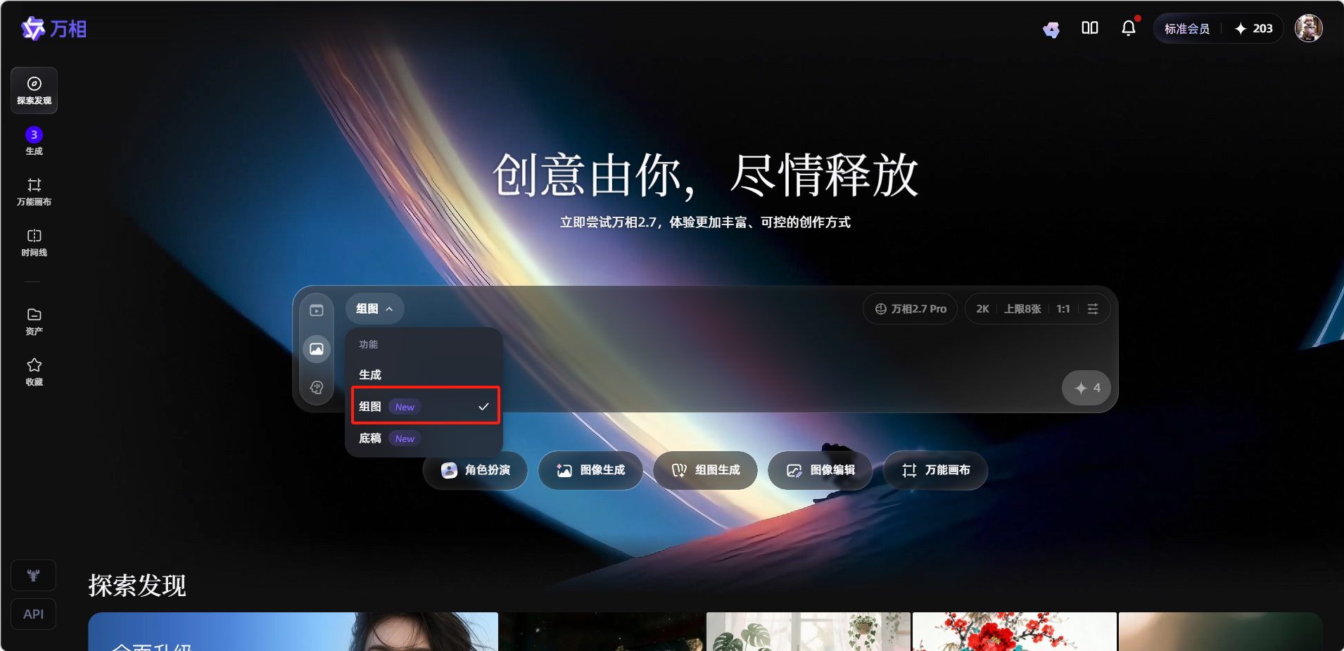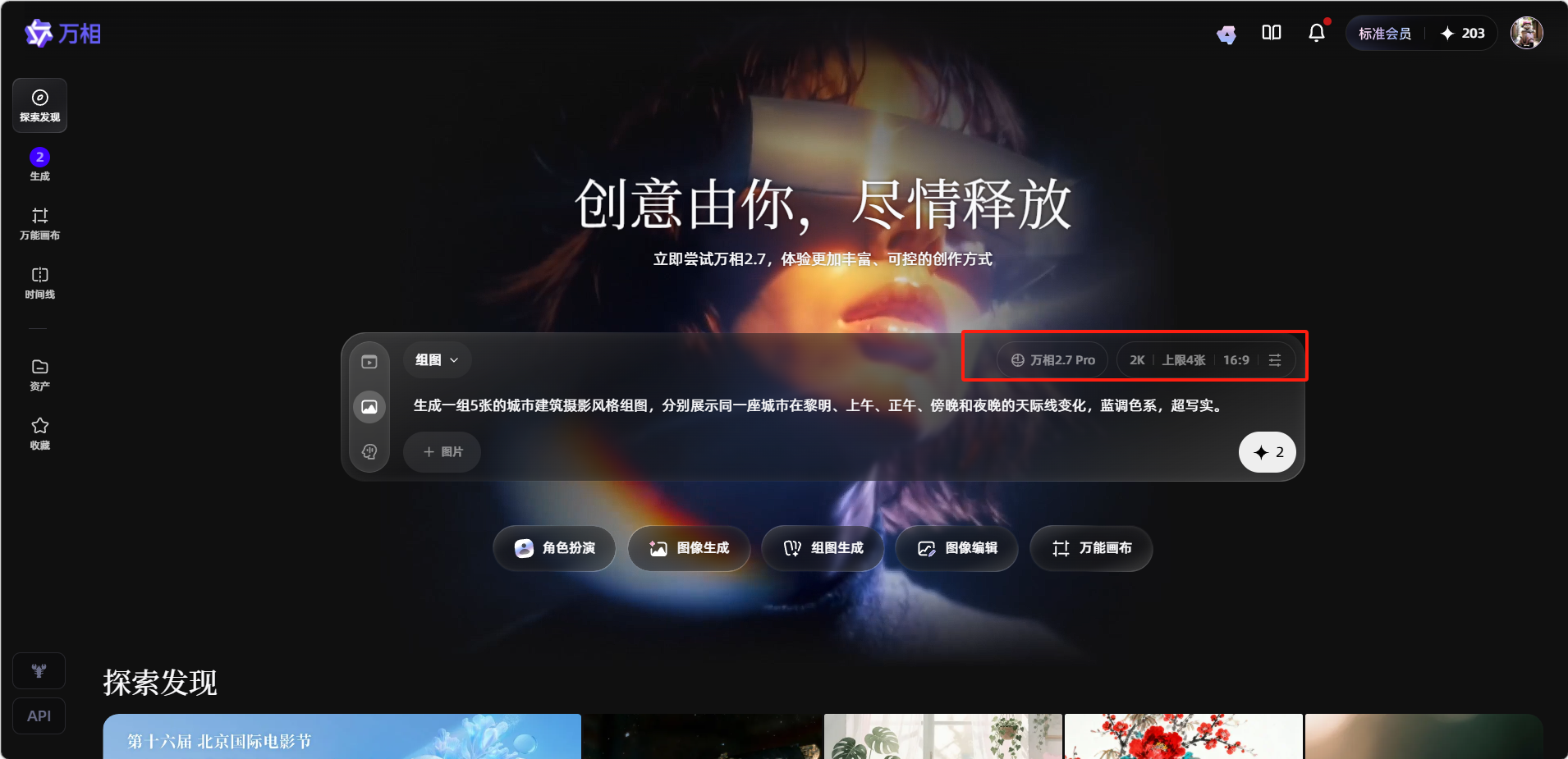 单次组图最多可生成 8 张,使用万相 2.7 Pro 模型,分辨率最高 2K。