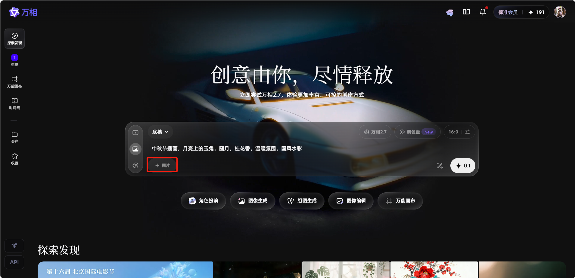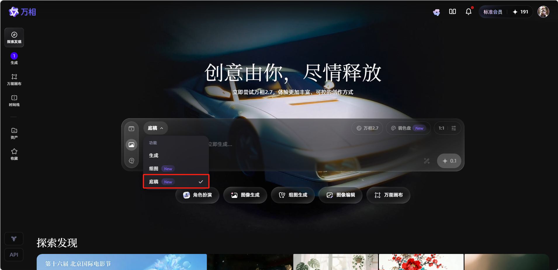 底稿的核心价值在于低成本试错。当用户有一个创意但不确定效果如何时,先用底稿功能生成草图,确认方向正确后再切换到正式生成模式出高质量图。底稿使用万相 2.7 模型,速度快,每次只消耗 0.1 灵感值,相当于免费试用。