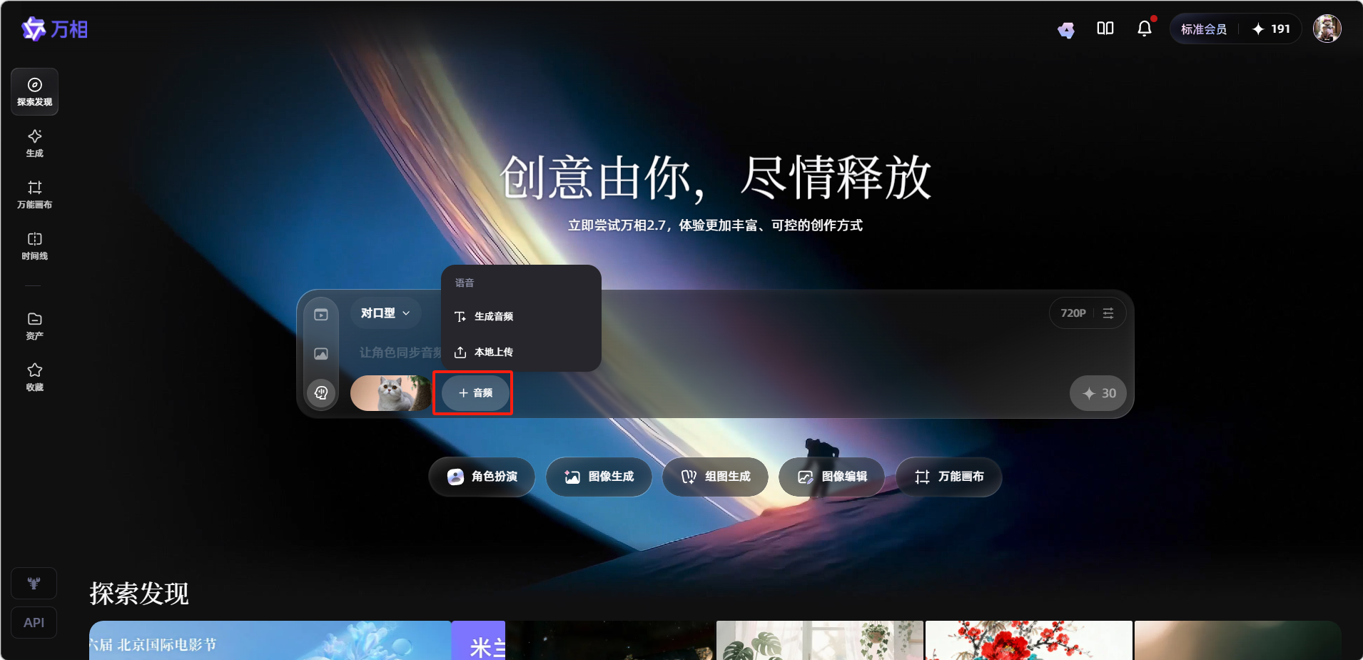 点击「+ 音频」,上传音频文件,或选择输入文本生成音频。