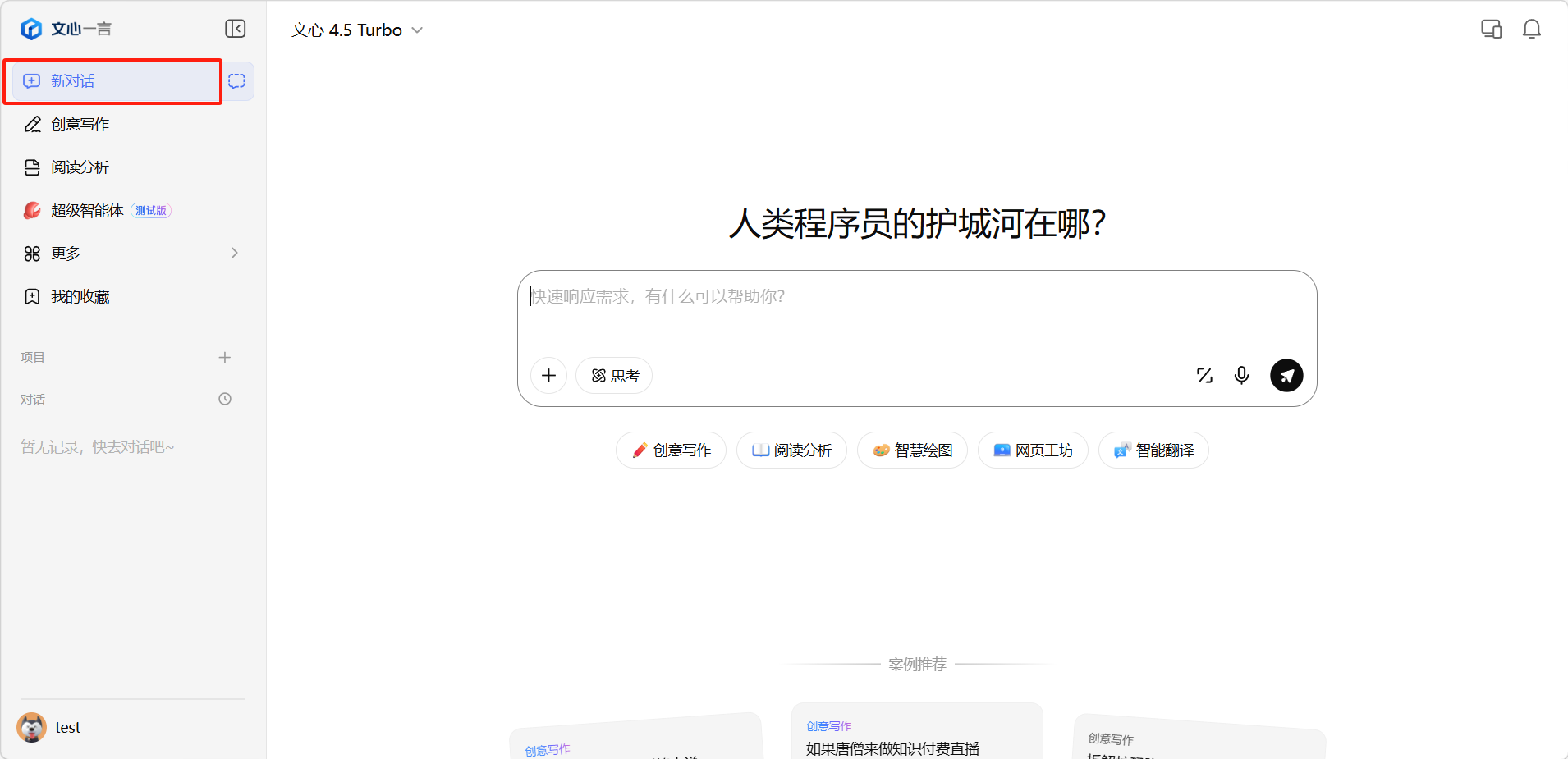 点击左侧边栏的「新对话」按钮即可开始新的对话。在页面中央的输入框中输入你的问题,点击发送按钮或按回车键即可。