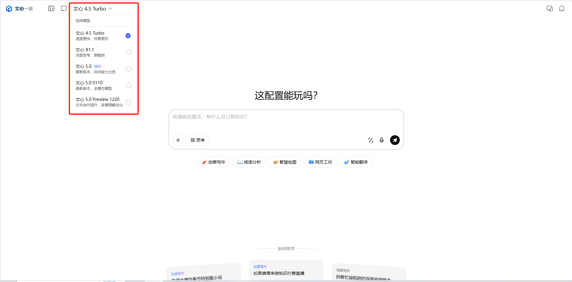 文心一言目前提供多个模型版本可供选择。在页面顶部点击模型名称可以切换不同模型。