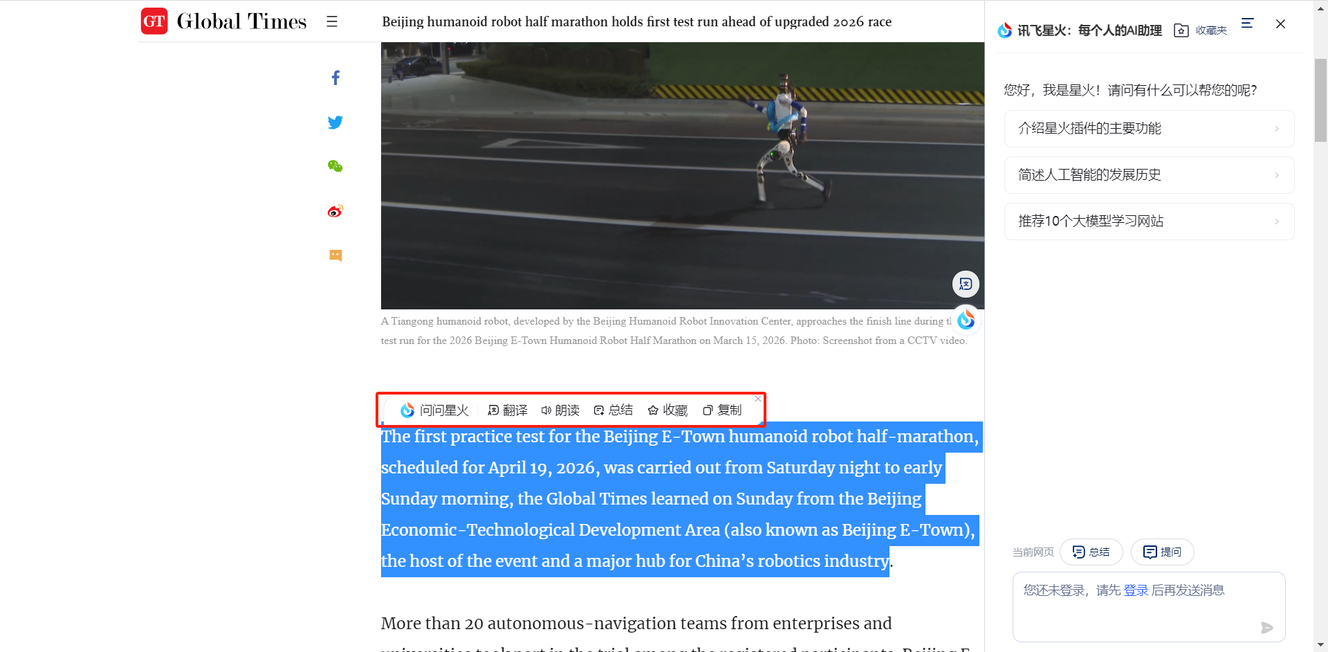 你可以对外语资料进行网页摘要和文档总结。此外,下载星火桌面版或浏览器插件后,可以: