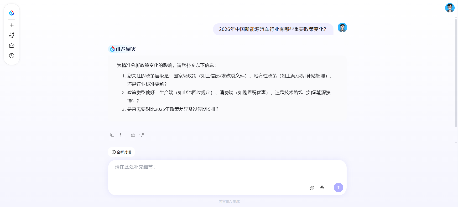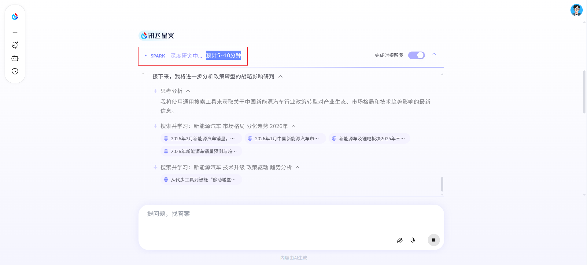 当遇到一些需要复杂推理的问题,可以在对话框上方选择「分析研究」功能。讯飞星火会引导用户输入详细的描述,进行深度分析,返回信息量更丰富、更有深度的答案。