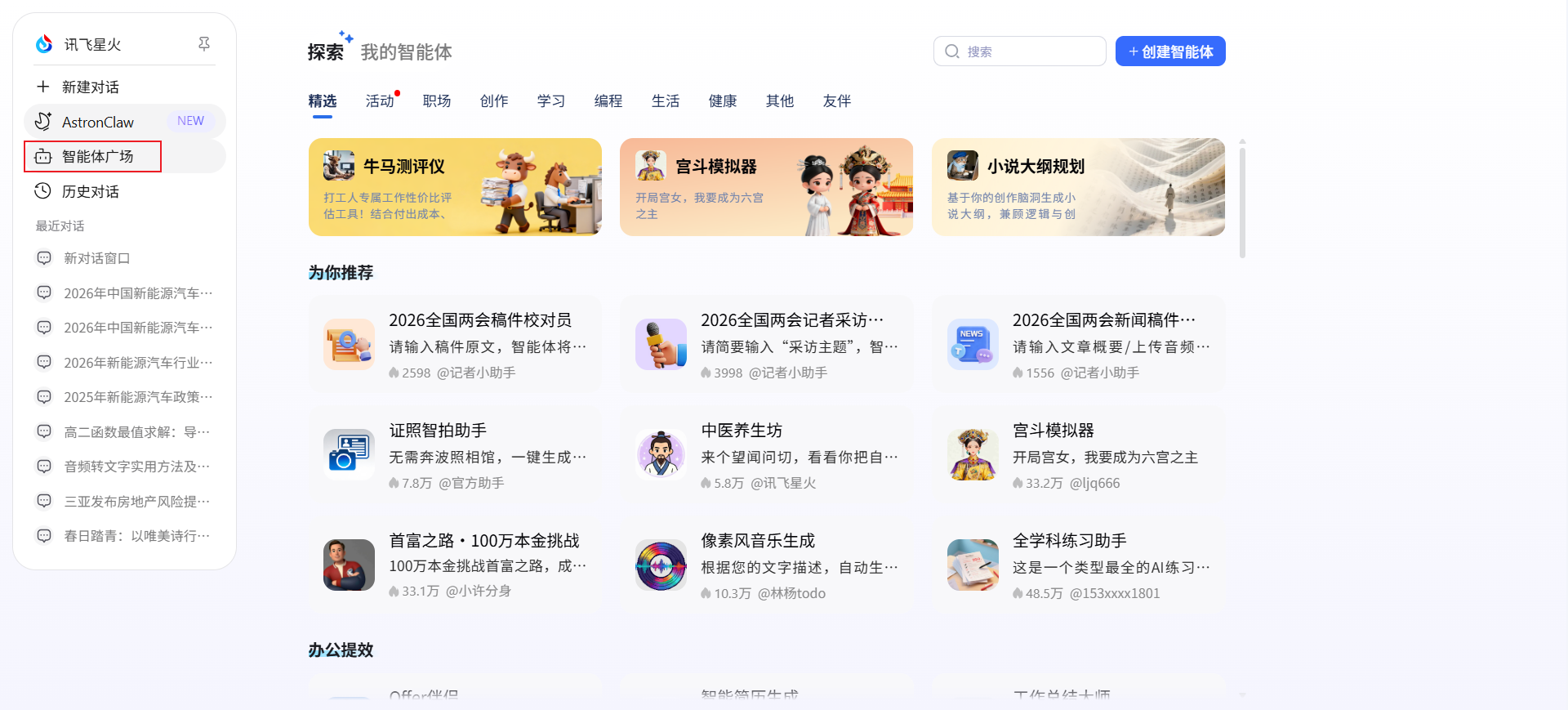 目前讯飞星火智能体广场已汇聚 75,000+ 智能体,覆盖工作、学习、生活、娱乐、创作等几乎所有日常场景,点击左侧边栏的「智能体广场」入口即可使用智能体。
