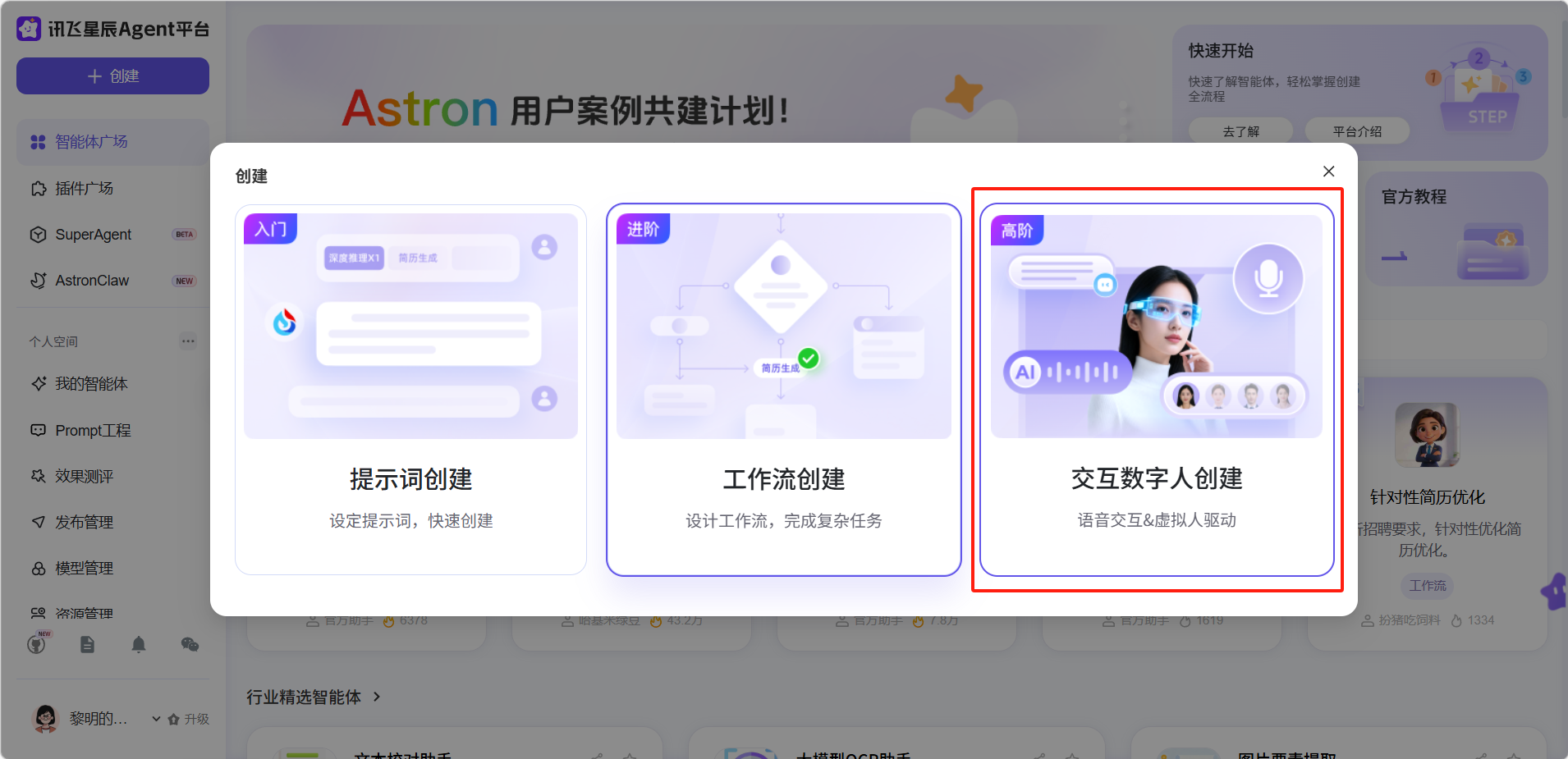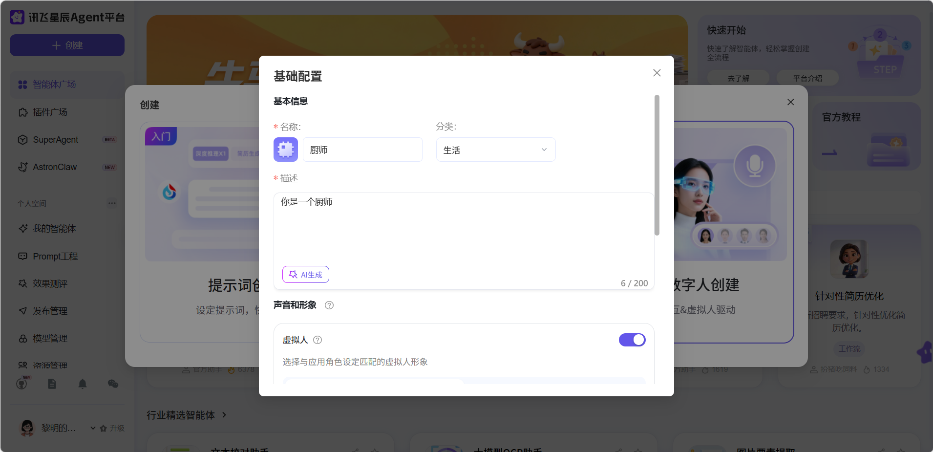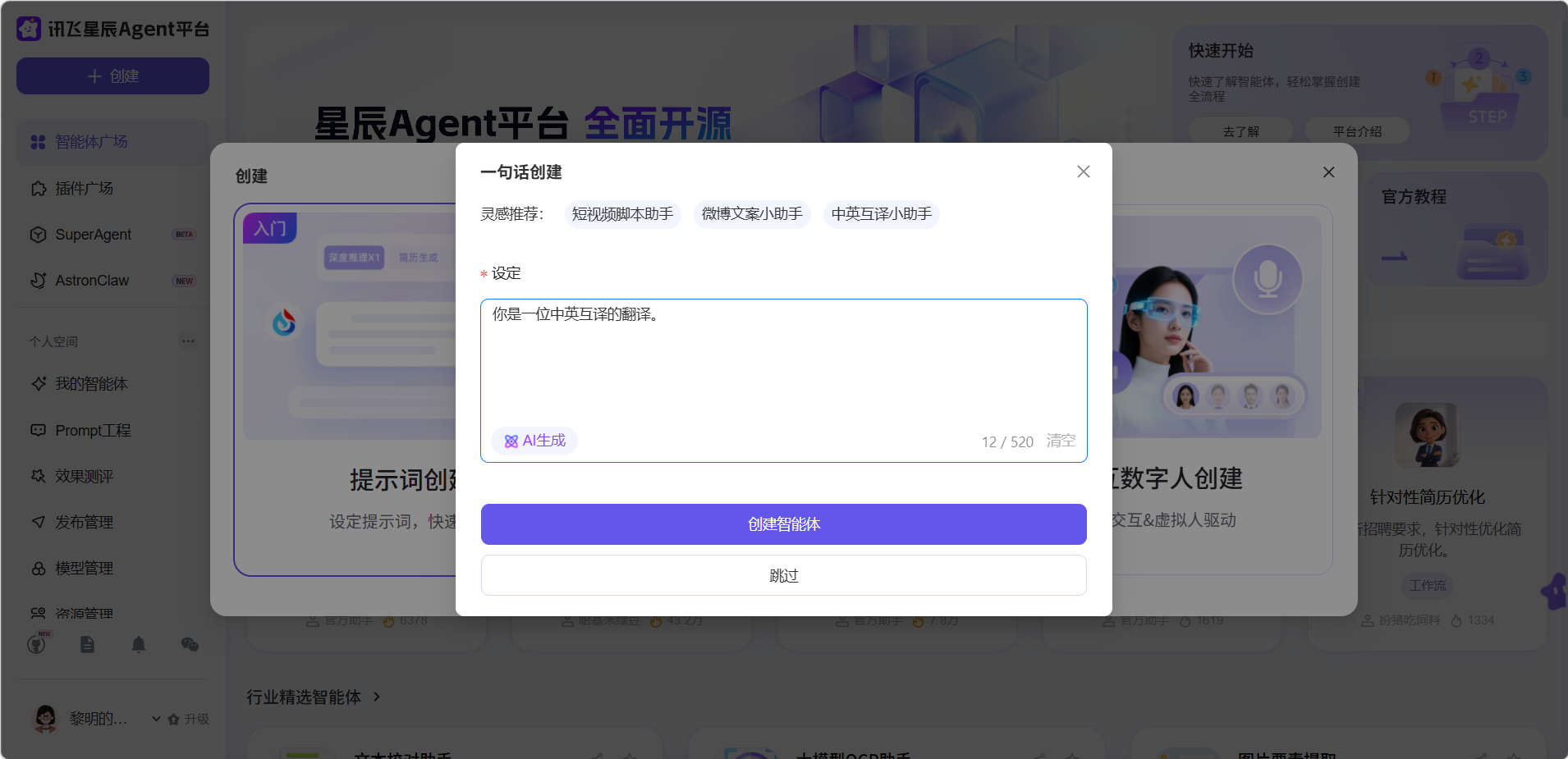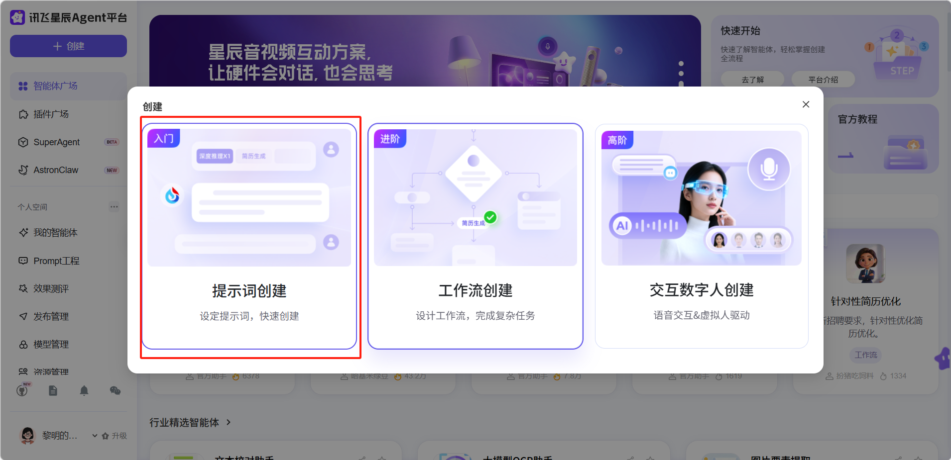 提示词创建是讯飞星火智能体平台最基础、最易上手的创建方式。它采用对话模式接收提示词并调用大模型生成结果,无需任何编程知识,适合简单对话或文字处理类场景。
