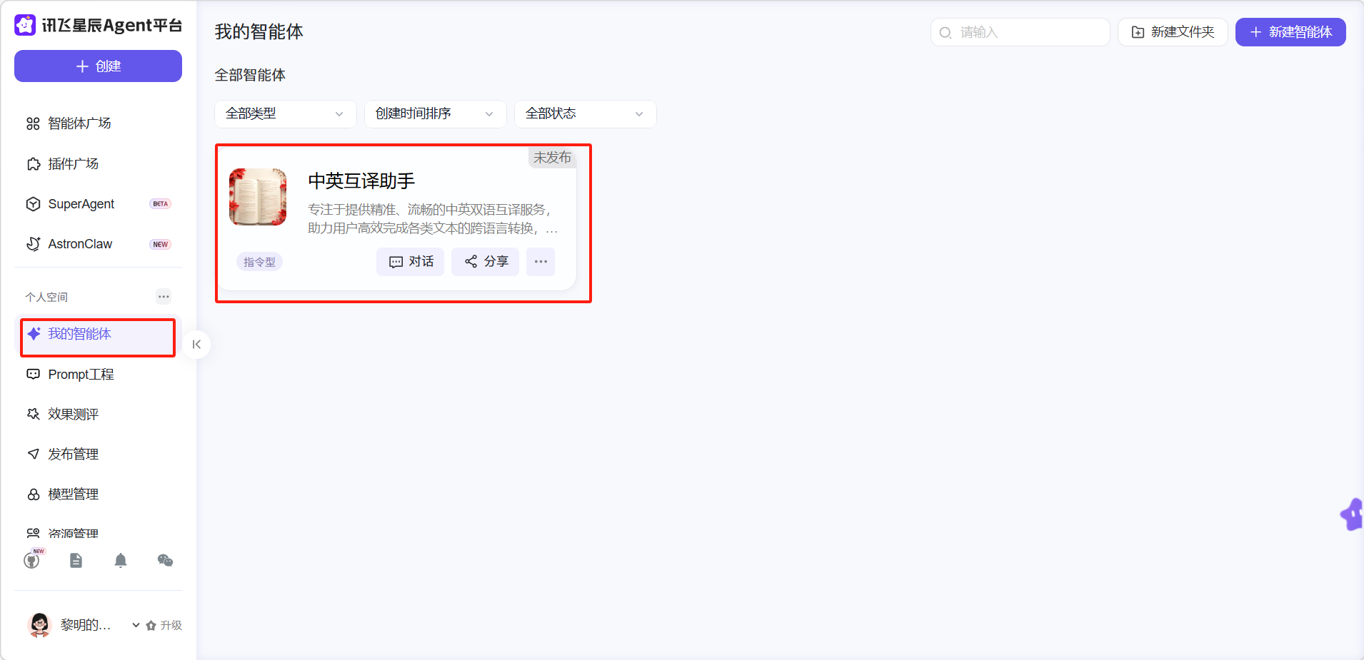 调整完成后即可点击右上角的「创建」按钮创建智能体,创建完成后可以在「我的智能体」中找到。