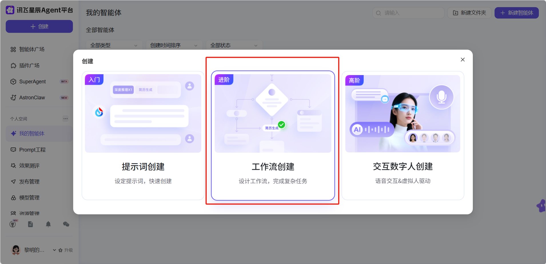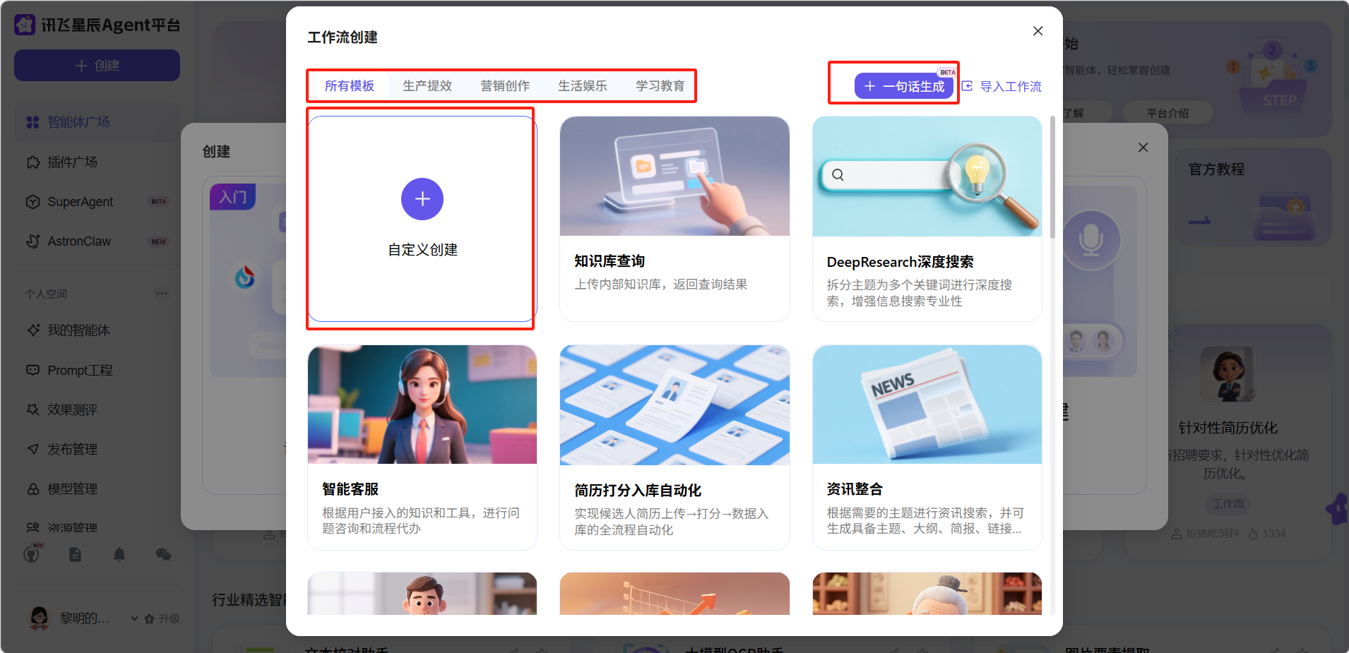 - 自定义创建:用户自己设置工作流里面的模块和智能体