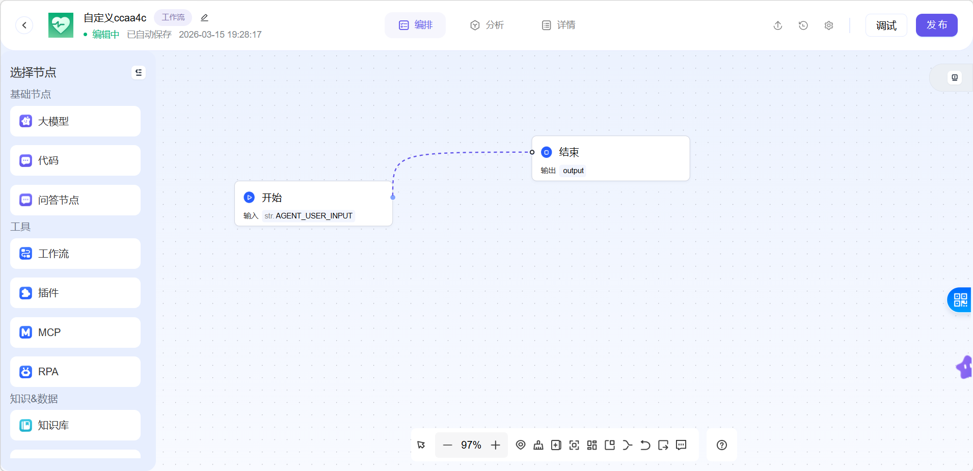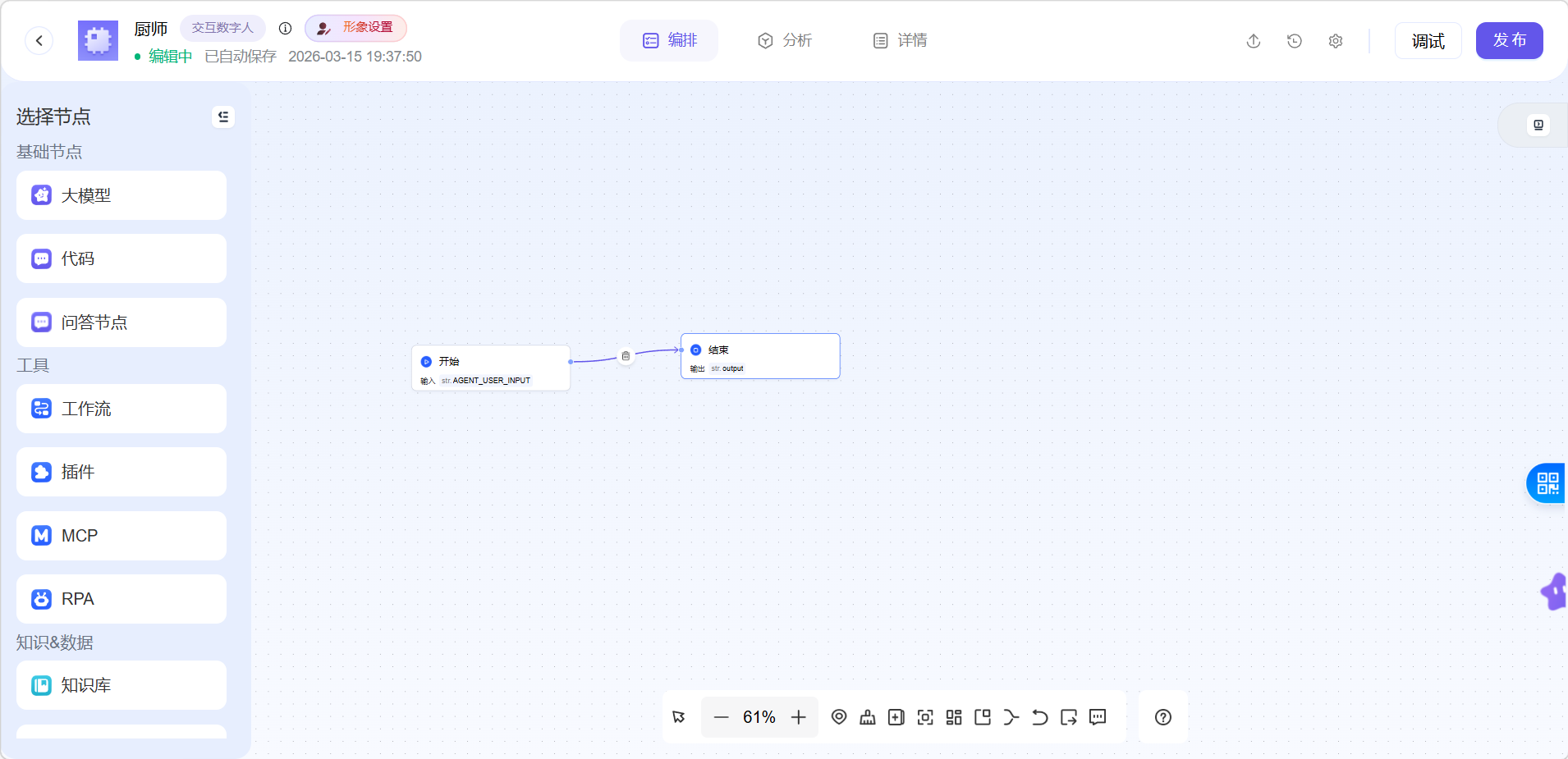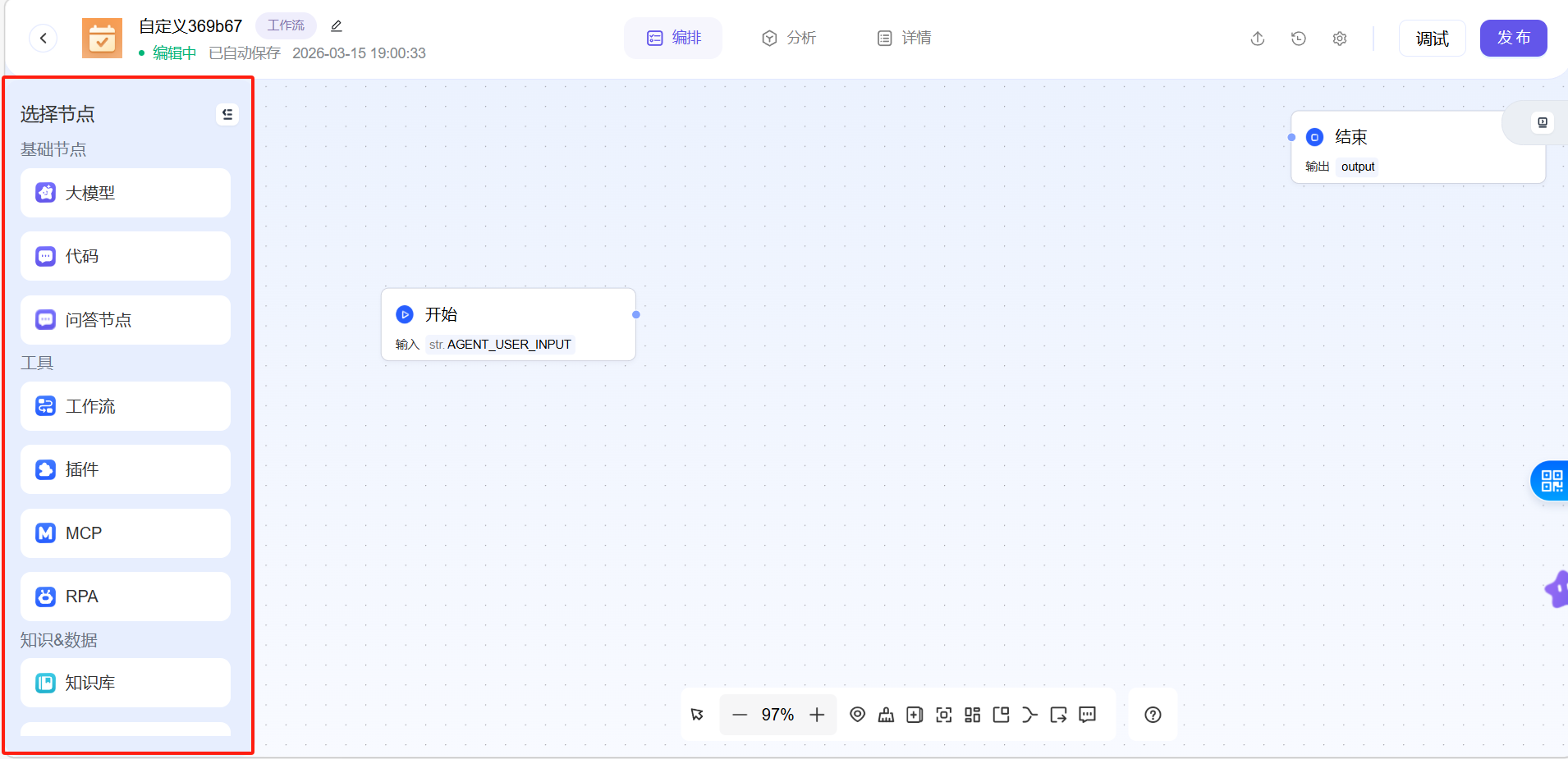 选择好创建方式后,会进入工作流界面,右侧有许多节点可以选择,供用户自行搭配。工作流里默认添加了开始和结束节点。