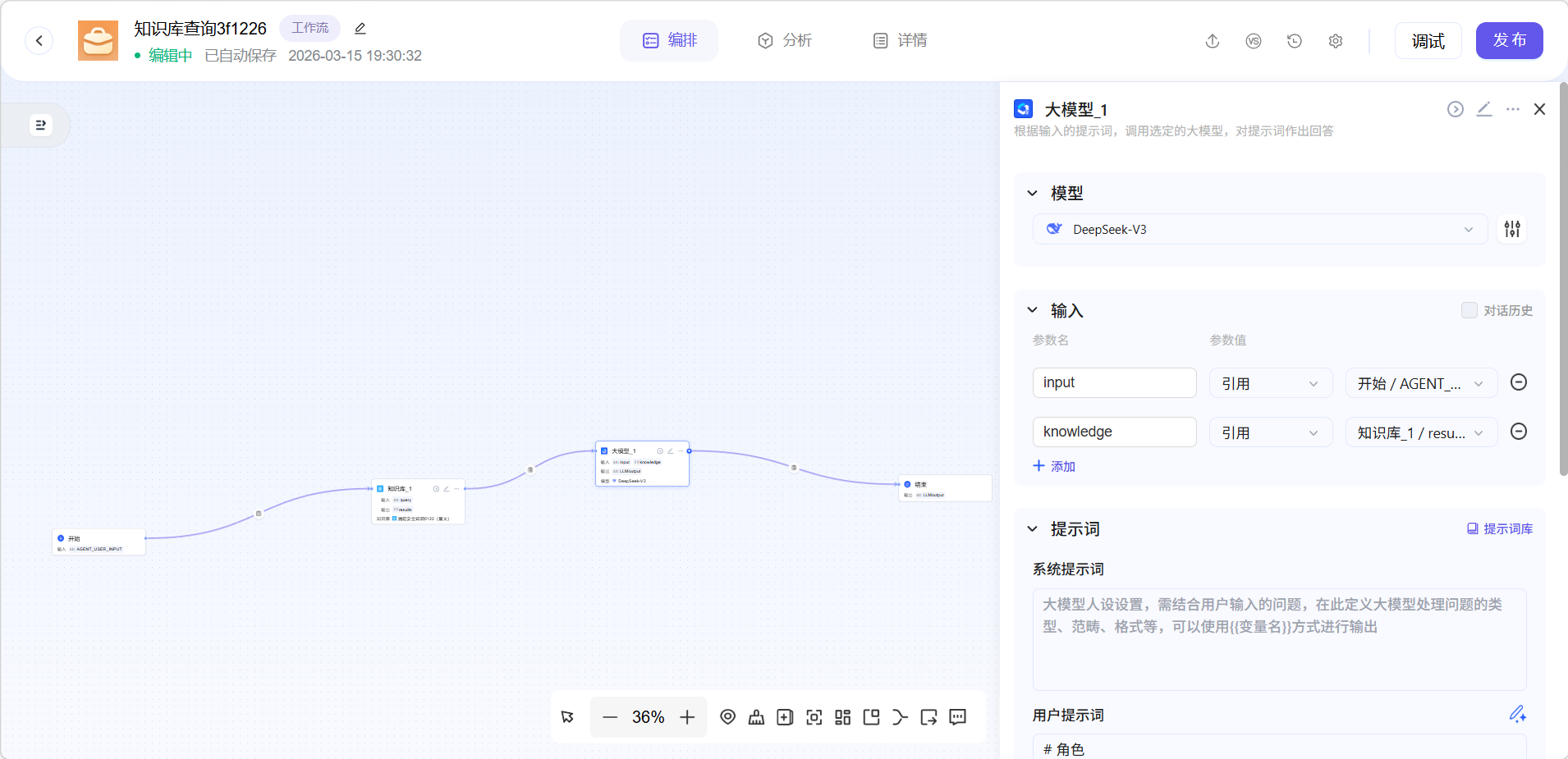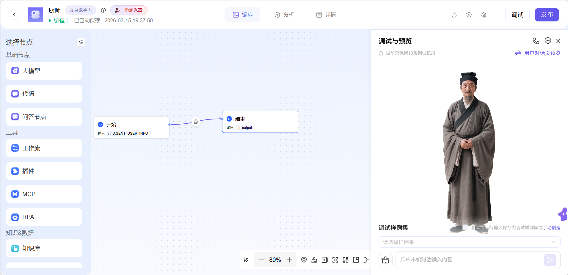 在工作流界面设定好需要的节点后,点击调试即可与数字人进行对话。