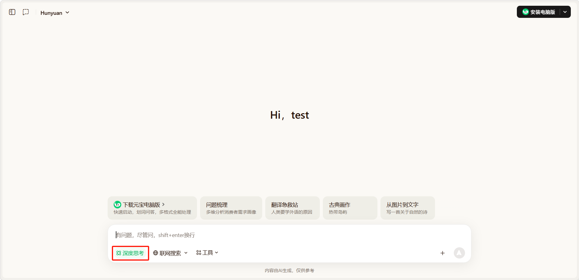 元宝支持深度思考模式,对应不同模型的推理能力。