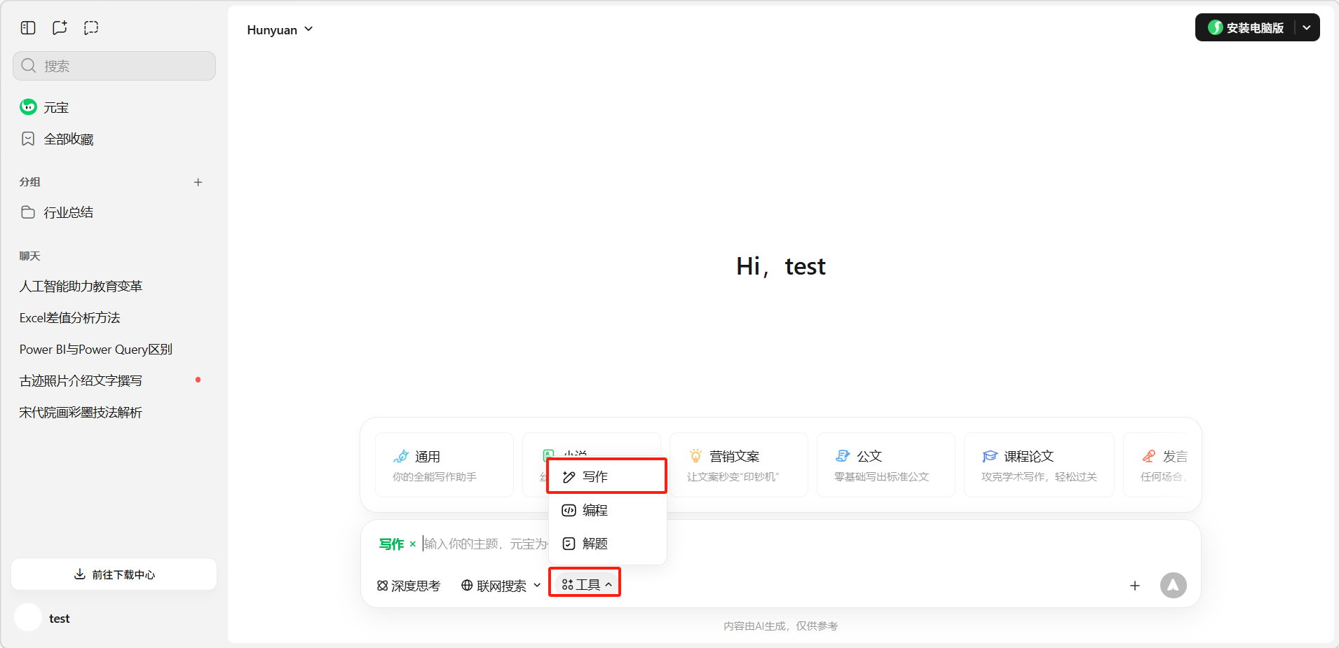 元宝提供了专门的AI写作工具,可以通过输入框下方的「工具」菜单中找到「写作」入口,上方还有许多提示词模板可以选择。