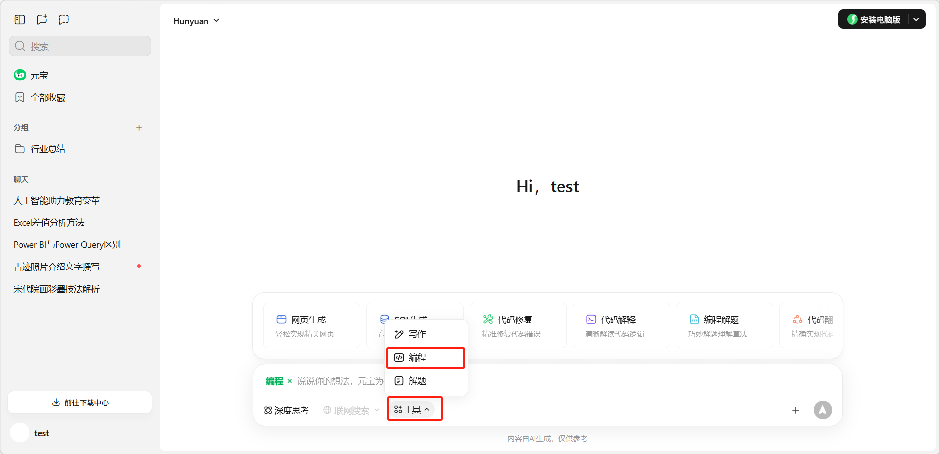 元宝的编程功能让用户无需本地开发环境,即可在线生成、修改和运行代码。支持多种编程语言直接在线运行,无需配置任何环境。点击输入框左下角「工具」菜单中的「编程」入口即可进入。上方还可以选择模板对ai进行提问。