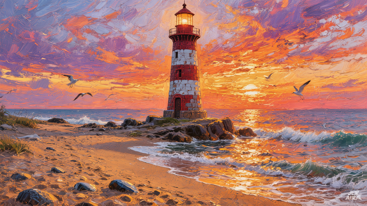 帮我画一张日落下的海边灯塔,油画风格,暖色调。比例16:9