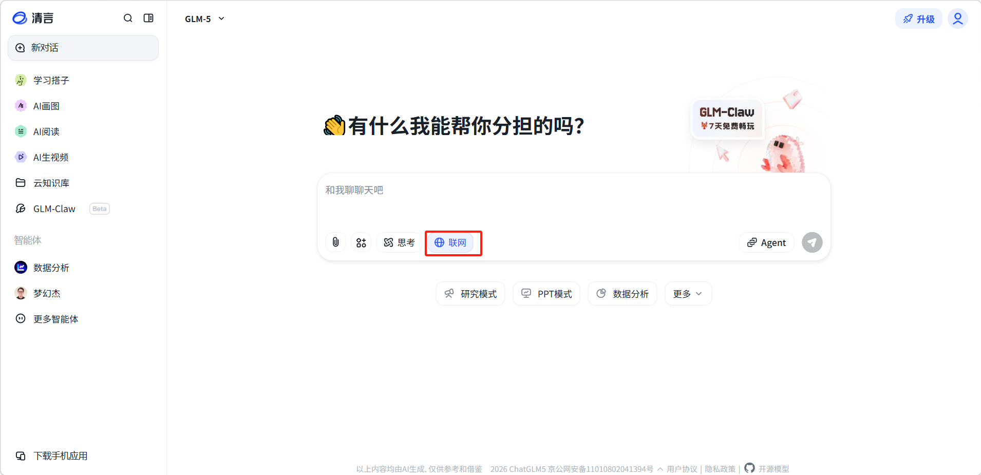 在输入框底部的工具栏中,点击「 联网」按钮即可开启联网搜索模式。开启后,AI会在回答时自动检索互联网相关信息。