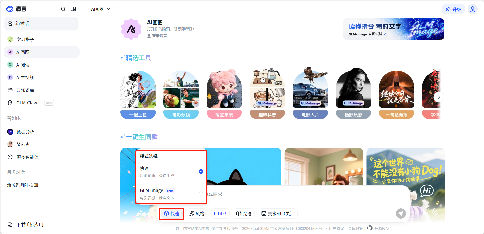 智谱清言提供了两种生成图片的模式,用户可以按照需求选择,点击左下角按钮即可切换。